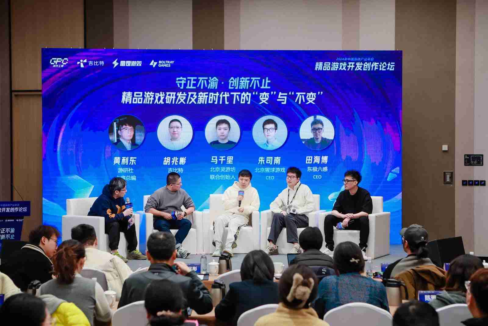 圆桌对话环节,,,在游研社内容总编黄利东的主持下,,,,yaxin111CTO胡兆彬、、北京灵游坊联合创始人马千里、、、北京猩球游戏CEO朱司南、、、东极六感CEO田海博等四位嘉宾围绕“守正不渝、、、创新不止——精品游戏研发及新时代下的‘变’与‘不变’”这一主题分享了各自在精品游戏开发理念及工程能力搭建方面的见解和经历,,并就行业变化下游戏人需要坚守的理念等展开交流探讨。。。。