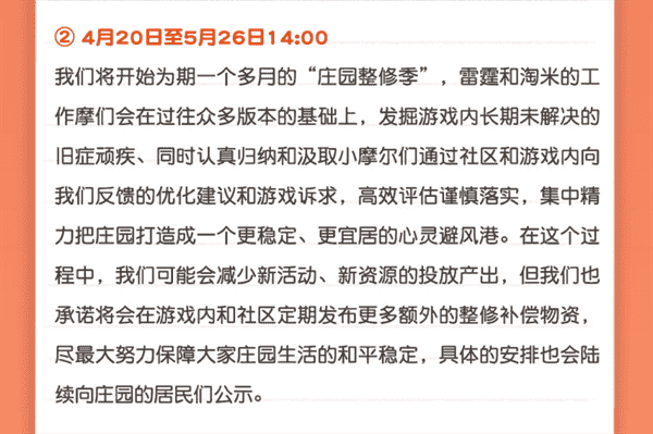 合作的结束并不意味着这个童年IP的结束,,对于《摩尔庄园》手游而言,,,这是一个新阶段的开始。。。后续游戏内将开启庄园重构计划,,,,会就以往遗留下来的BUG进行集中修复,,并在游戏内和社区定期发布更多补偿物资。。。