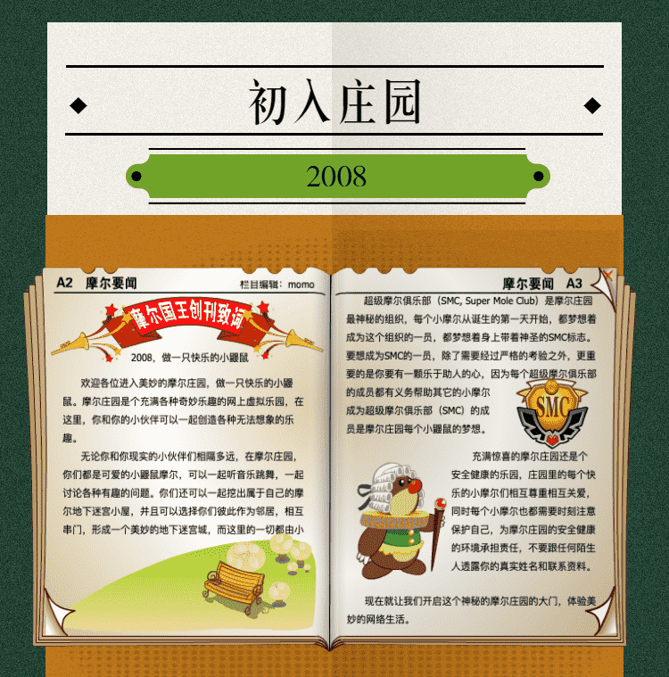 在这一年,,,,摩尔庄园诞生了。。。。在这里,,大家都是可爱的红鼻子鼹鼠小摩尔,,,,可以一起勤劳耕作,,一起高山滑雪......我们都是摩尔庄园的建设者。。