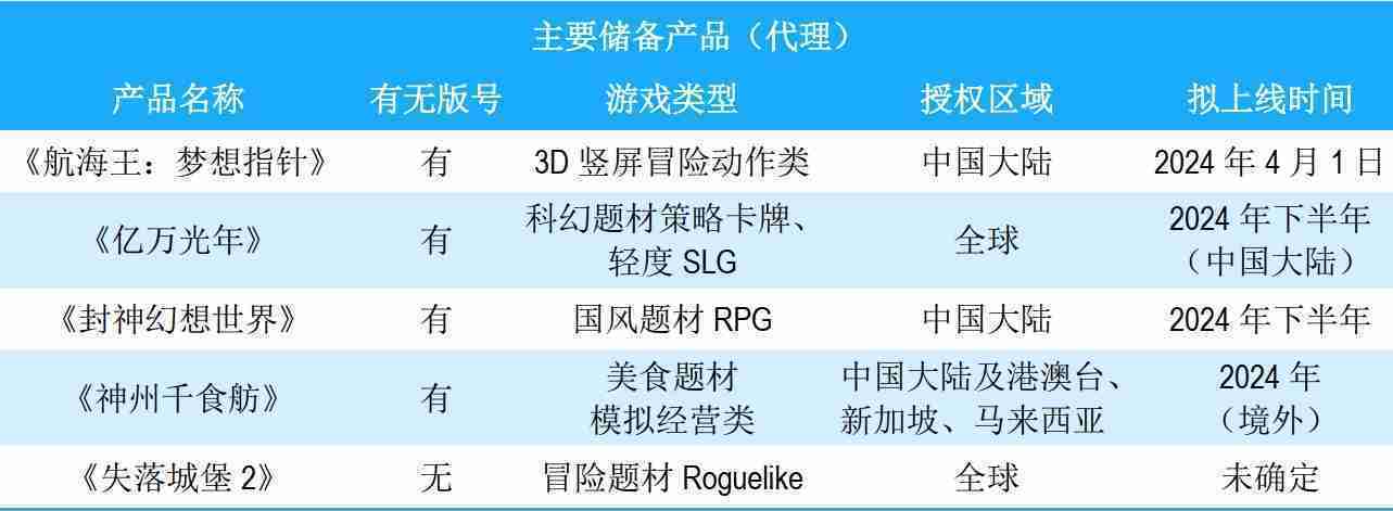 公司储备的多个自研、、代理产品都在有序推进当中,,涵盖放置类、、策略类、、模拟经营类、、RPG、、Roguelike等多元化游戏品类,,,,储备的主要自研和代理产品如下:::